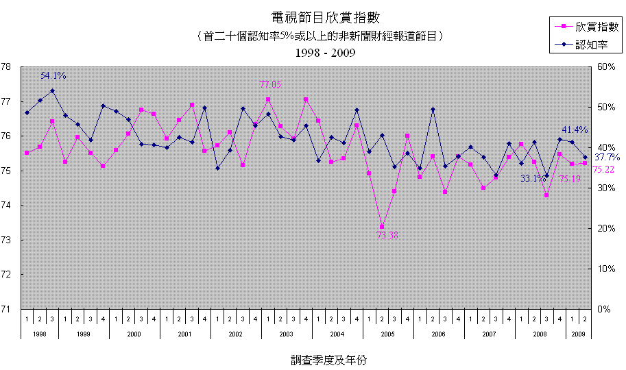 平均欣賞指數及認知率 - 首二十個認知率5%或以上的非新聞財經節目 (1998 - 2009)