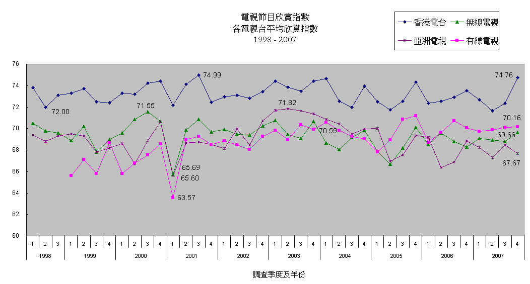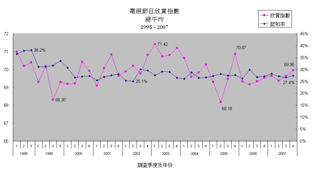 各電視台平均欣賞指數及認知率 (1998 - 2007)