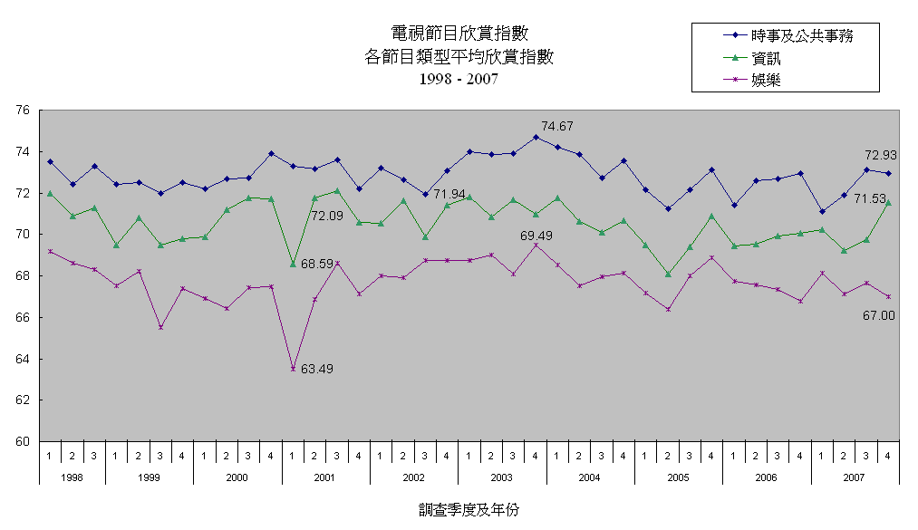 各節目類型平均欣賞指數及認知率 (1998 - 2007)