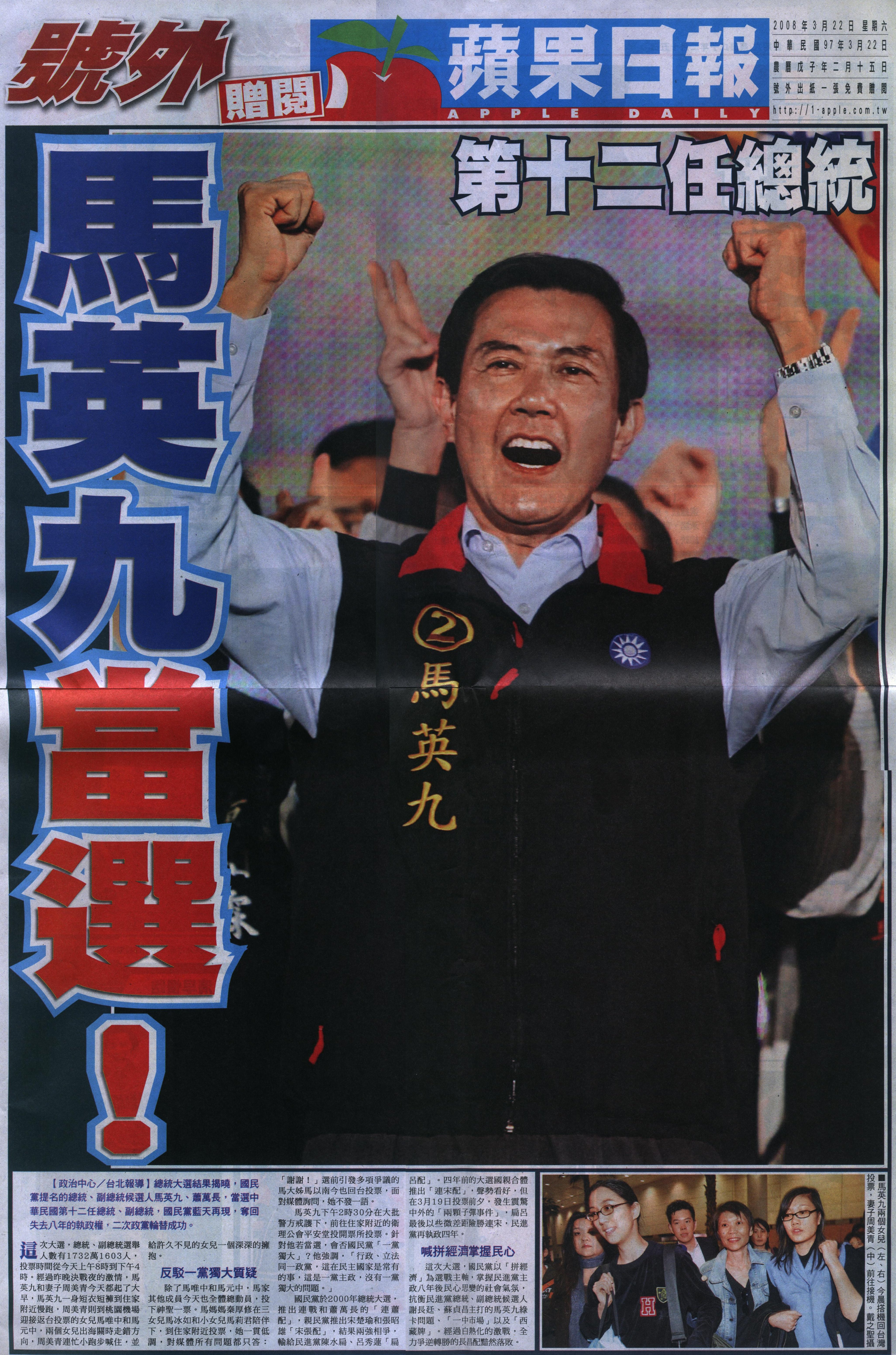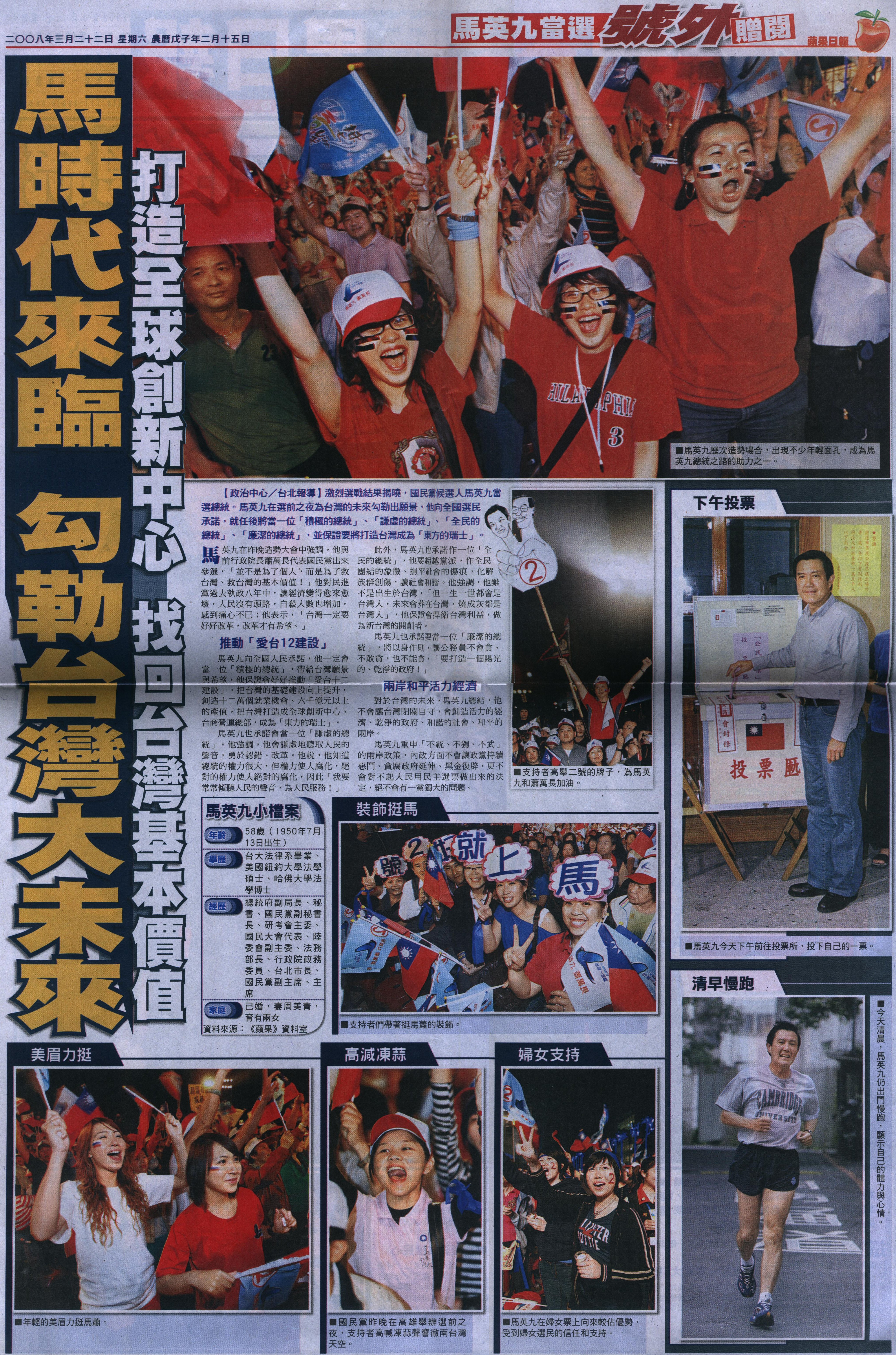 台灣蘋果日報 - 2008年3月22日號外第一頁:馬英九當選